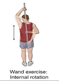 Έσω στροφή με ράβδο, ο ασθενής κρατά τη ράβδο πίσω από το σώμα του σε οριζόντια θέση. Απομακρύνει τη ράβδο από το σώμα του προς τα επάνω και την επαναφέρει στην αρχική θέση [21].